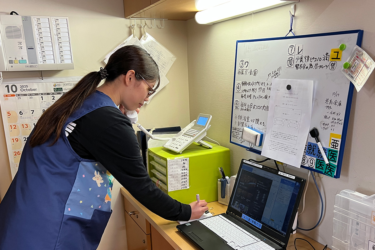 排泄介助、おやつの準備手伝い、PC記録